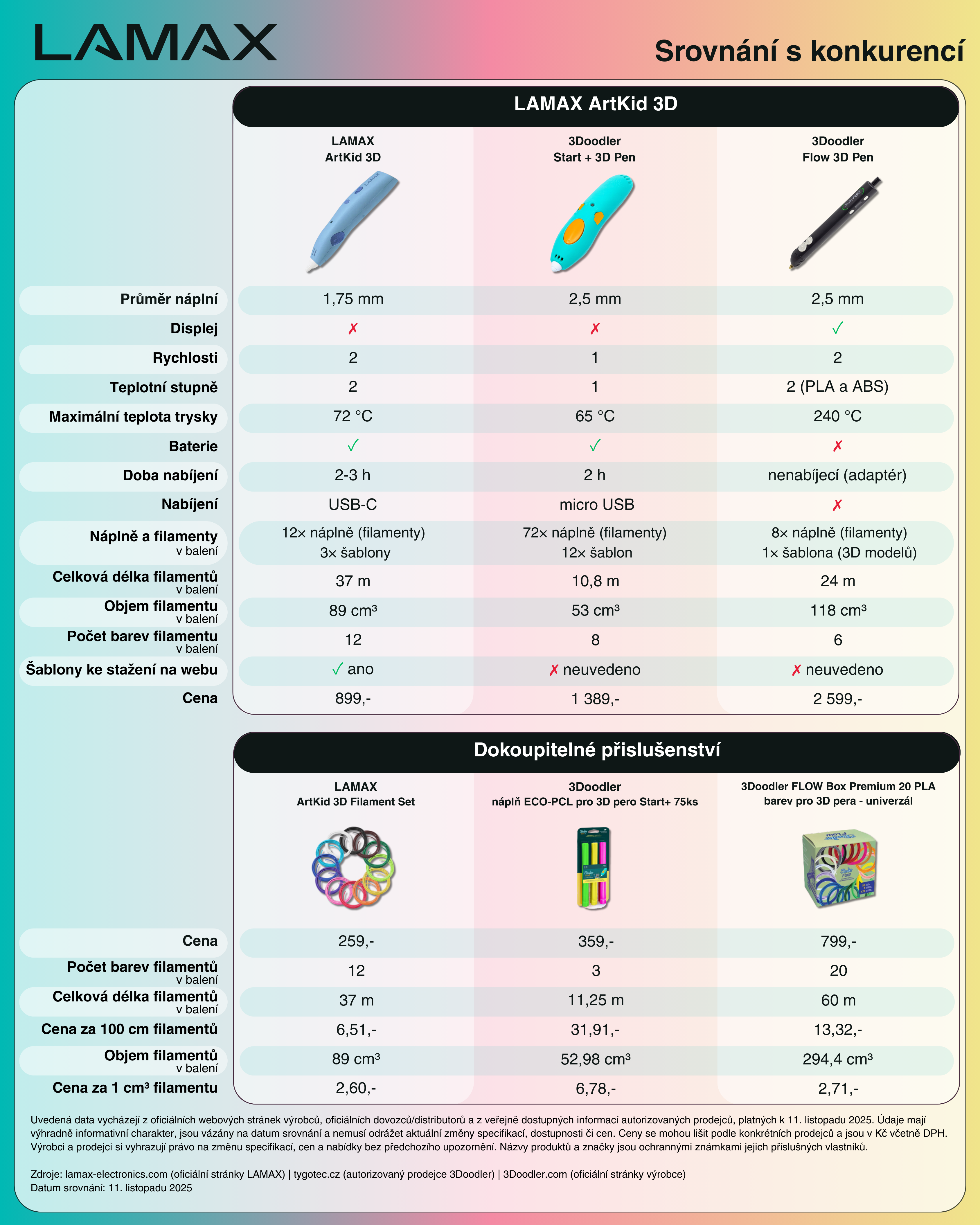 Pro časté používání doporučujeme sadu 3D filamentů LAMAX ArtKid1, která obsahuje více barev.